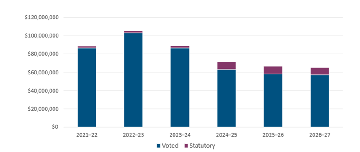 For the 2024-25 to 2026-27 fiscal years, total planned spending does not include funding through Supplementary Estimates and carry-forward adjustments. The funding level decreases in 2025-26 are primarily attributed to project completion and the sunsetting of the Budget 2023 initiatives for Indigenous participation in Northern environmental decision-making. In 2026-27, a further reduction in funding is anticipated due to the sunsetting of Budget 2023 program supporting the Tourism Growth Program in the territories.
